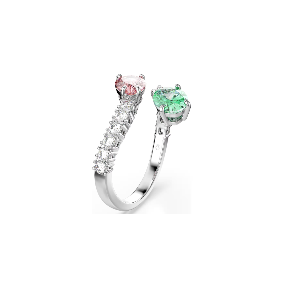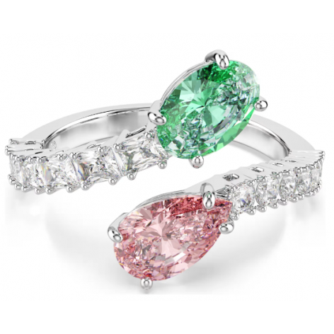 Magici colori e uno stile delicato si fondono insieme in questo gioioso anello. La fascia aperta è placcata rodio e impreziosita da un pavé di Swarovski Zirconia trasparenti, mentre due Swarovski Zirconia color pastello sono incastonate alle estremità, tra cui spiccano i tagli Oval verde e Pear rosa. Combina l’anello con gioielli coordinati della stessa famiglia per un look giocoso e completo.
