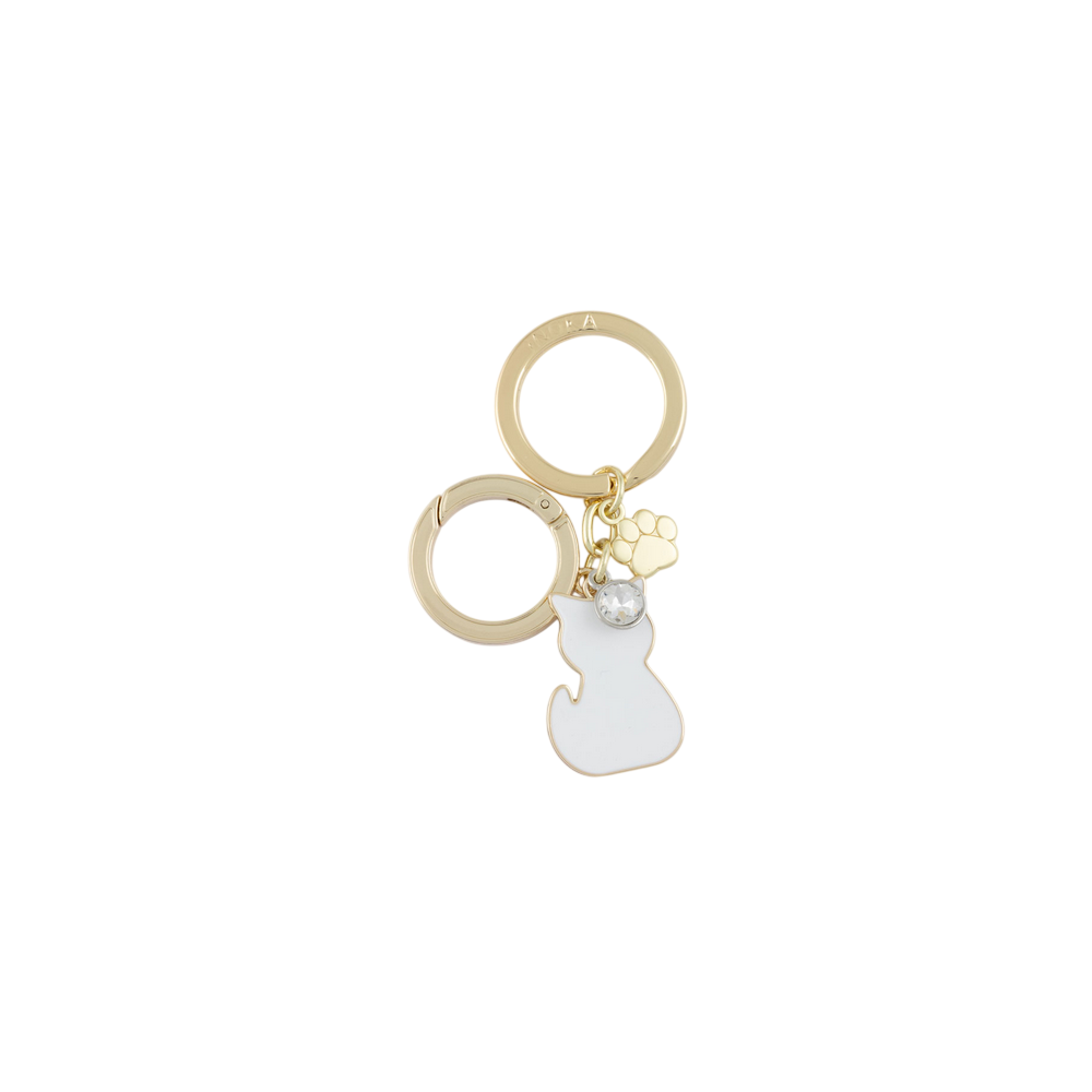 Portachiavi doppio con soggetto gatto in smalto bianco, strass e accessorio color oro.