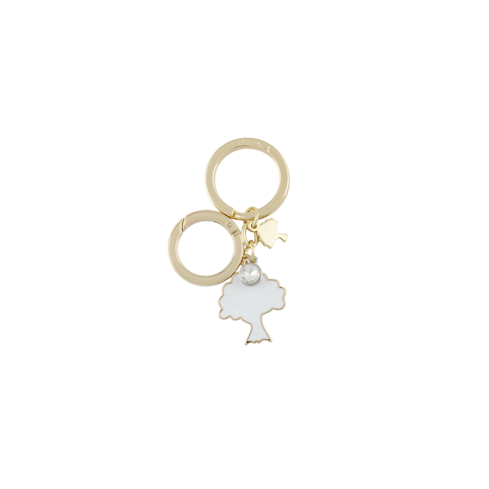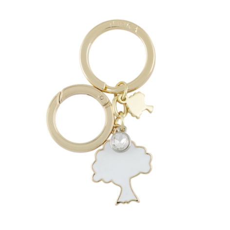 Portachiavi doppio con soggetto albero in smalto bianco, strass e accessorio color oro.