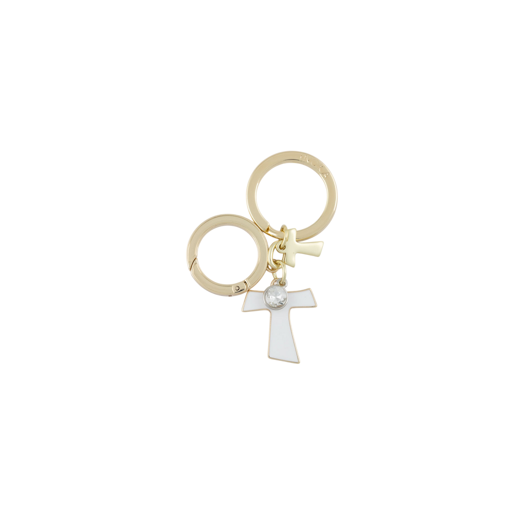 Portachiavi doppio con soggetto tao in smalto bianco, strass e accessorio color oro.