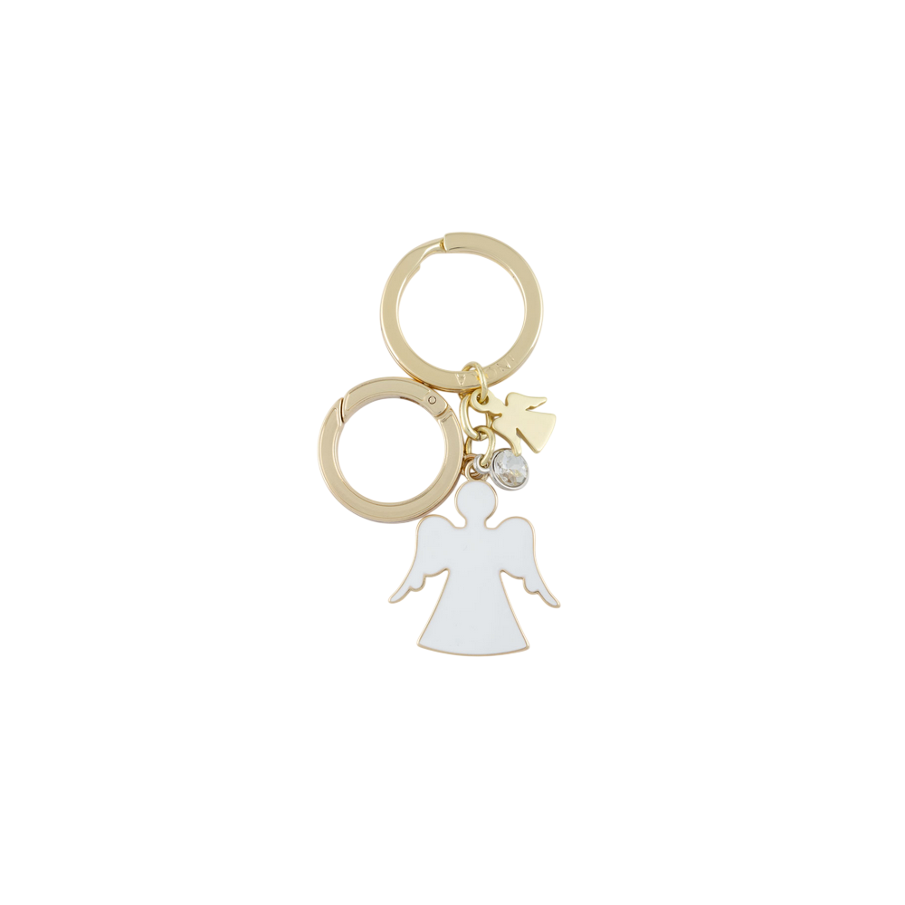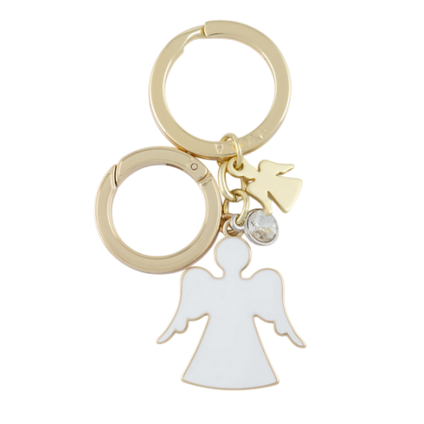 Portachiavi doppio con soggetto angelo in smalto bianco, strass e accessorio color oro.