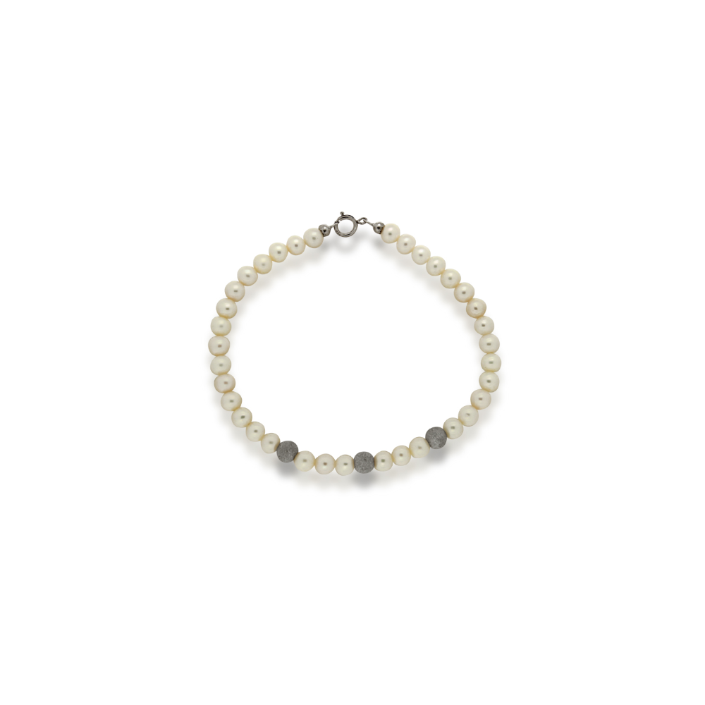Bracciale con perle coltivate di acqua dolce moschettone in oro bianco.