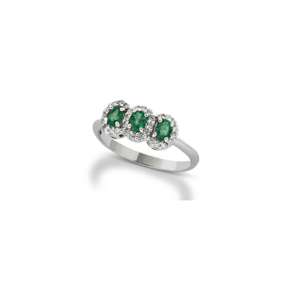 Anello in oro bianco con diamanti naturali a taglio brillante e smeraldo.