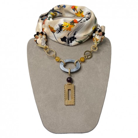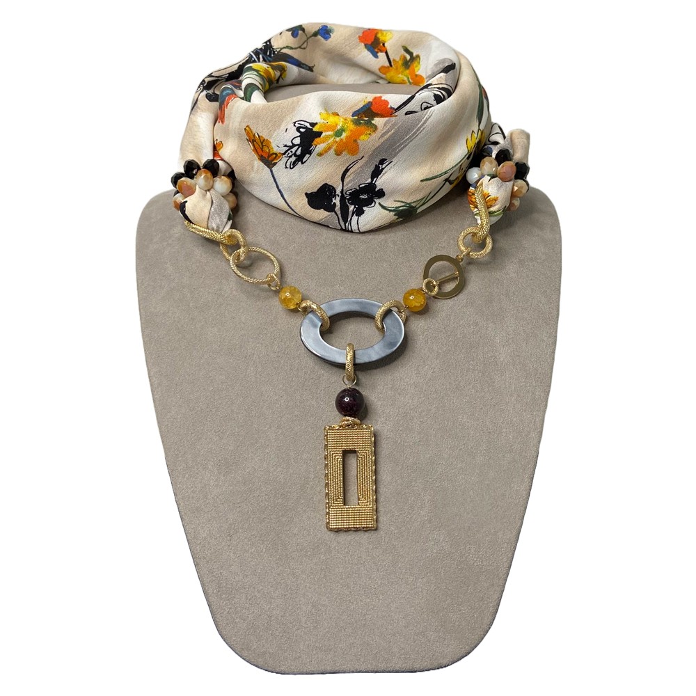 I foulard gioiello Rosada sono pezzi unici realizzati a mano, dove tessuti leggeri incontrano dettagli preziosi. Ogni creazione unisce eleganza e originalità, con pietre naturali, sfumature luminose e combinazioni di colori ricercate.