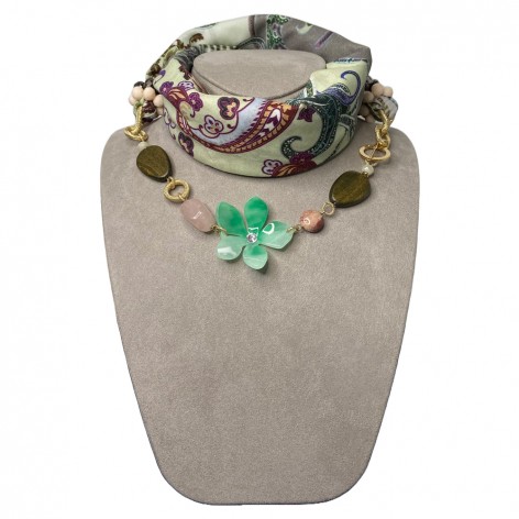 I foulard gioiello Rosada sono pezzi unici realizzati a mano, dove tessuti leggeri incontrano dettagli preziosi. Ogni creazione unisce eleganza e originalità, con pietre naturali, sfumature luminose e combinazioni di colori ricercate.