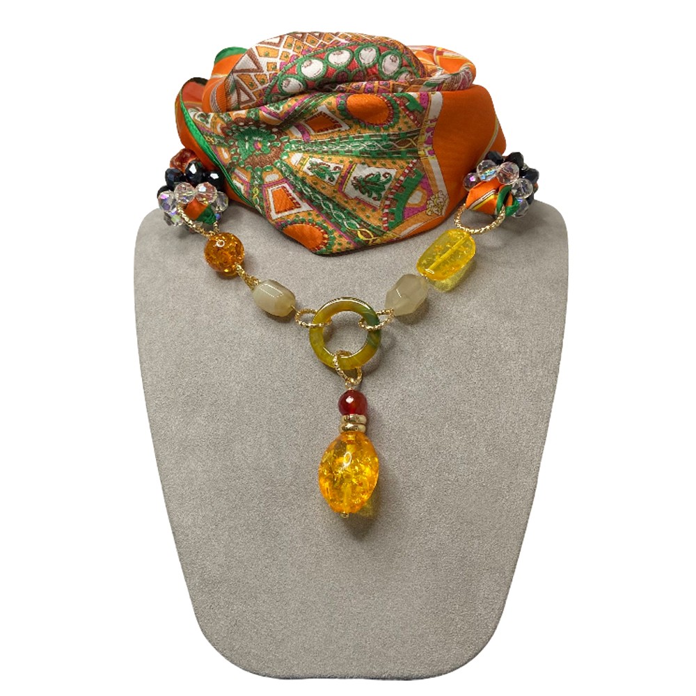 I foulard gioiello Rosada sono pezzi unici realizzati a mano, dove tessuti leggeri incontrano dettagli preziosi. Ogni creazione unisce eleganza e originalità, con pietre naturali, sfumature luminose e combinazioni di colori ricercate.