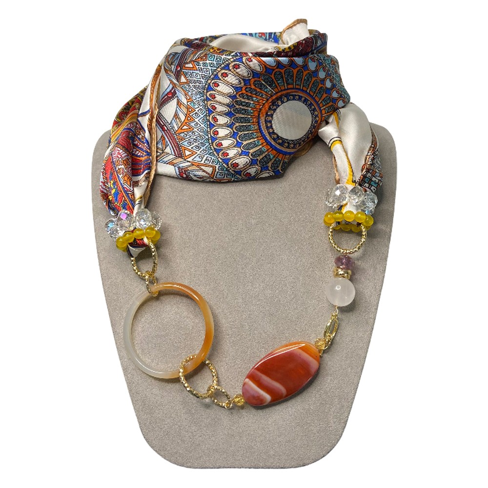 I foulard gioiello Rosada sono pezzi unici realizzati a mano, dove tessuti leggeri incontrano dettagli preziosi. Ogni creazione unisce eleganza e originalità, con pietre naturali, sfumature luminose e combinazioni di colori ricercate.