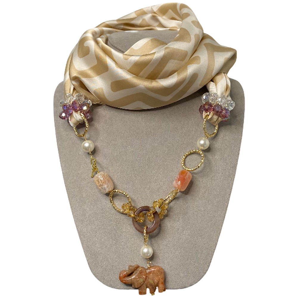 I foulard gioiello Rosada sono pezzi unici realizzati a mano, dove tessuti leggeri incontrano dettagli preziosi. Ogni creazione unisce eleganza e originalità, con pietre naturali, sfumature luminose e combinazioni di colori ricercate.