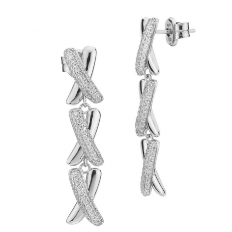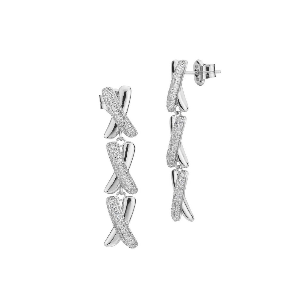 Orecchini pendenti in argento con tre moduli ad intreccio dalla superficie liscia, in pavè di zirconi e chiusura a farfalla.