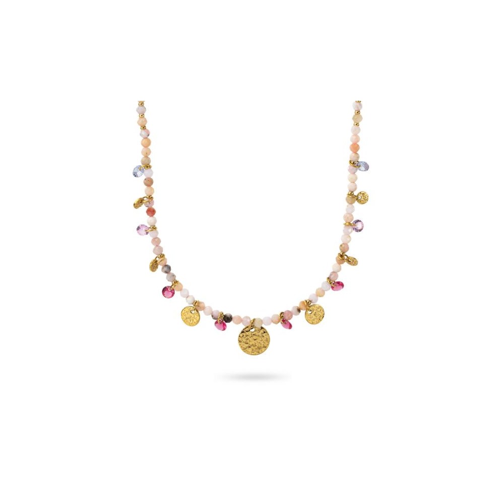 Girocollo in acciaio placcato oro giallo con boules di colore rosa, medaglie martellate placcate oro giallo e pietre naturali di colore purple.
