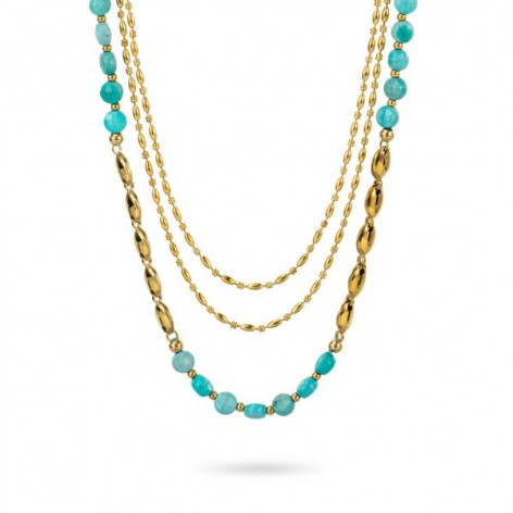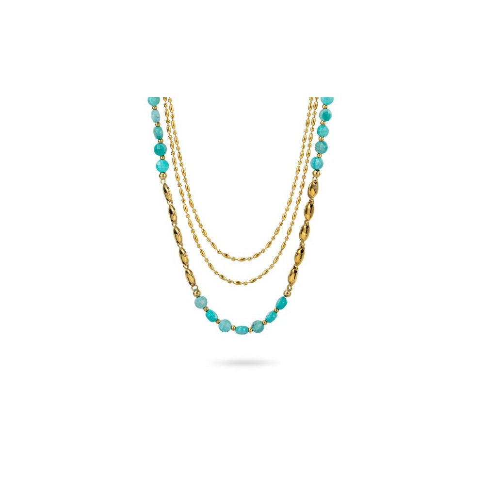 Girocollo in acciaio placcato oro giallo composto da tre fili placcati oro giallo, uno con boules di colore azzurro alternati a blocchi di grani placcati oro giallo.