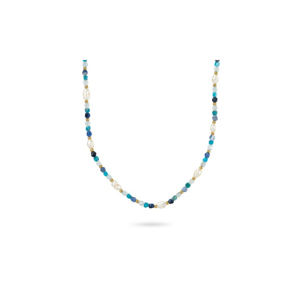 Girocollo in acciaio con pietre multiformi blu, acquamarina e bianche e boules placcate oro giallo