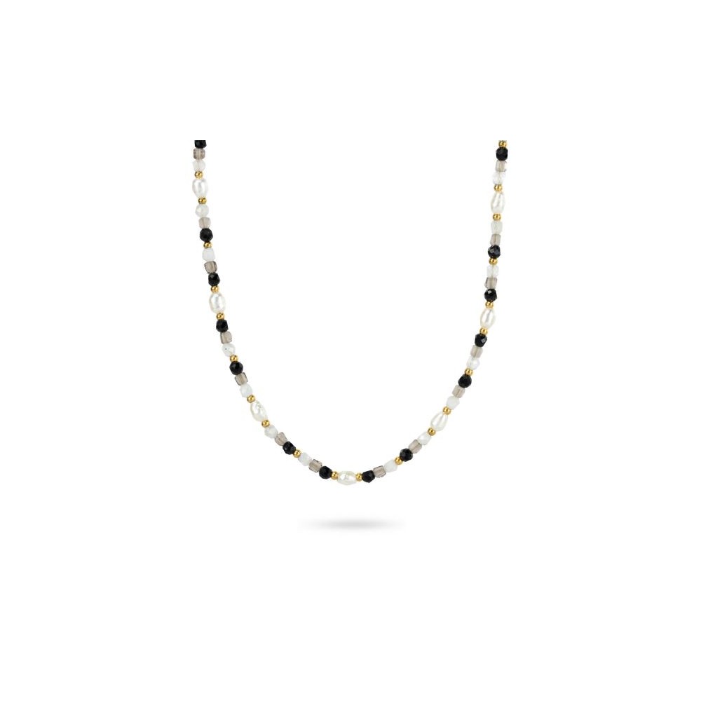 Girocollo in acciaio con pietre multiformi nero, grigie e bianche e boules placcate oro giallo