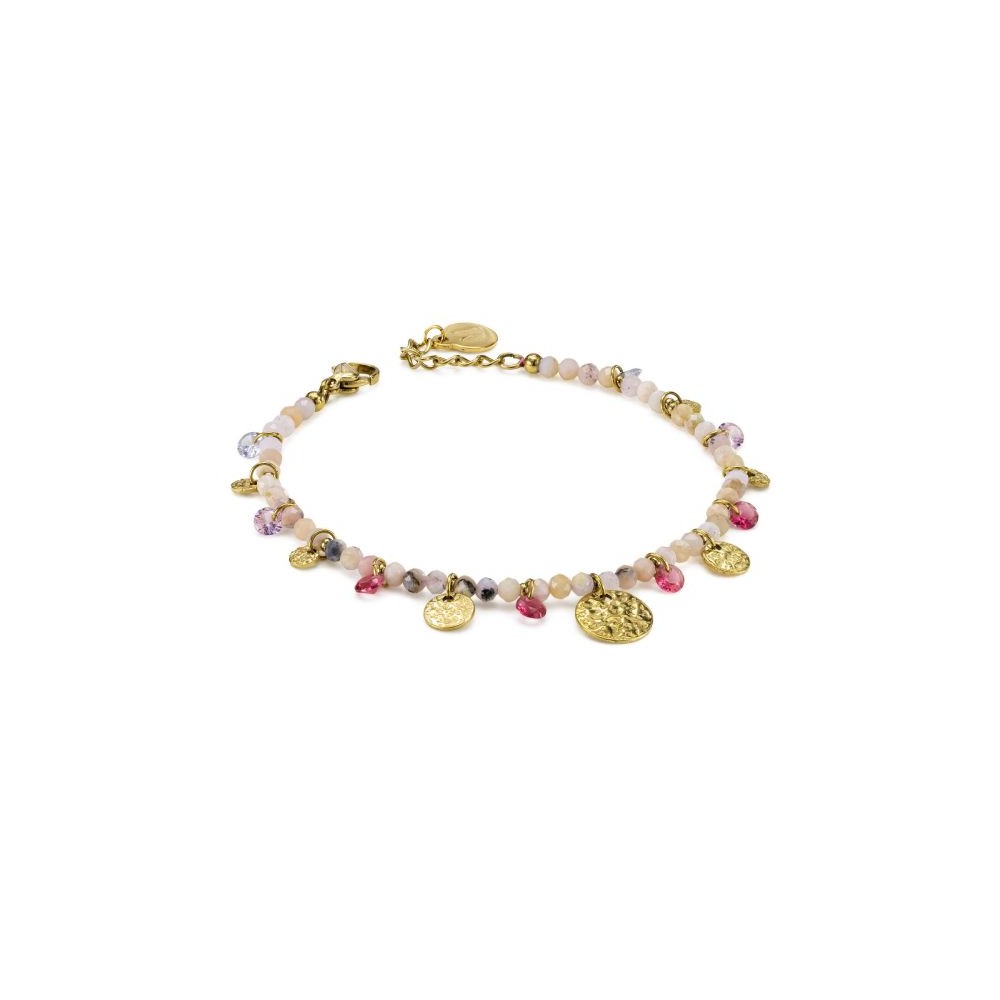 Bracciale in acciaio placcato oro giallo con boules di colore rosa, medaglie martellate placcate oro giallo e pietre naturali di colore purple