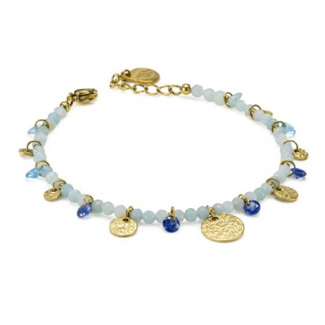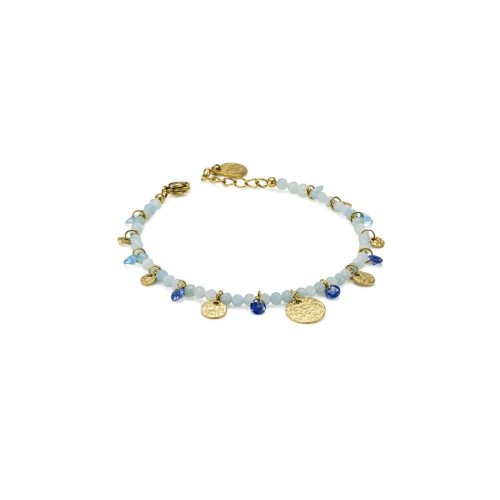 Bracciale in acciaio placcato oro giallo con boules di colore acquamarina, medaglie martellate placcate oro giallo e pietre naturali di colore azzurro