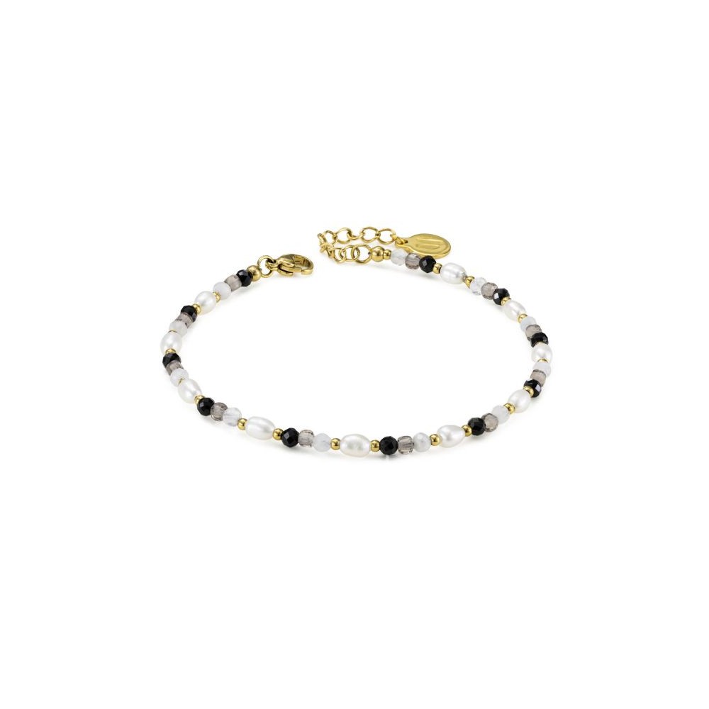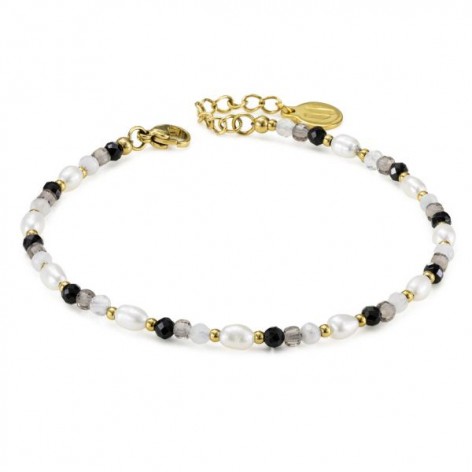 Bracciale in acciaio con pietre multiformi nero, grigie e bianche e boules placcate oro giallo