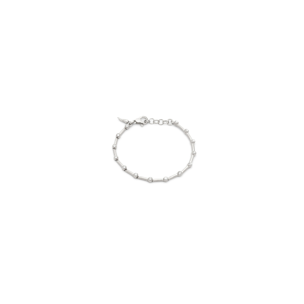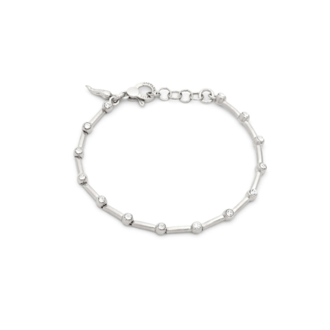 Leggerezza e luce si intrecciano in questo bracciale, composto da tredici elementi lineari in argento impreziositi da delicati punti luce in zircone. Ogni dettaglio è studiato per seguire con naturalezza il movimento del polso, mentre la chiusura regolabile completa il gioiello con discrezione. Un bracciale di raffinata eleganza, interamente realizzato a mano in azienda, che cattura la luce e riflette bagliori sottili ad ogni gesto.