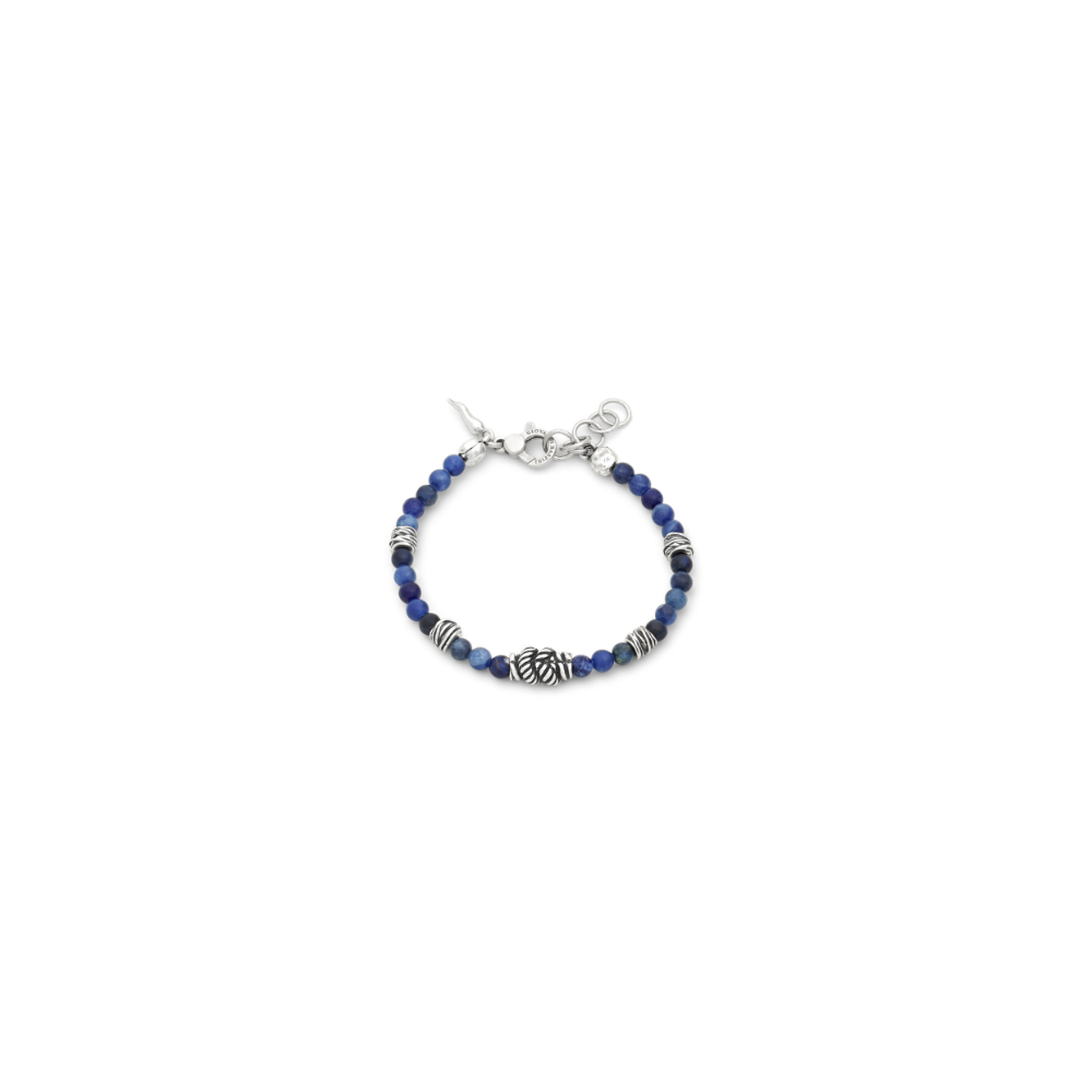 Un elegante bracciale, ove le sferette in sodalite sono armonicamente abbinate ad un elemento centrale decorativo in argento. Esso è in forma di nodo ed è accompagnato da altri piccoli elementi, sempre in argento, che intervallano ritmicamente la sequenza delle pietre. La tonalità intensa della sodalite valorizza i dettagli in argento. Fatto a mano in azienda