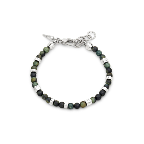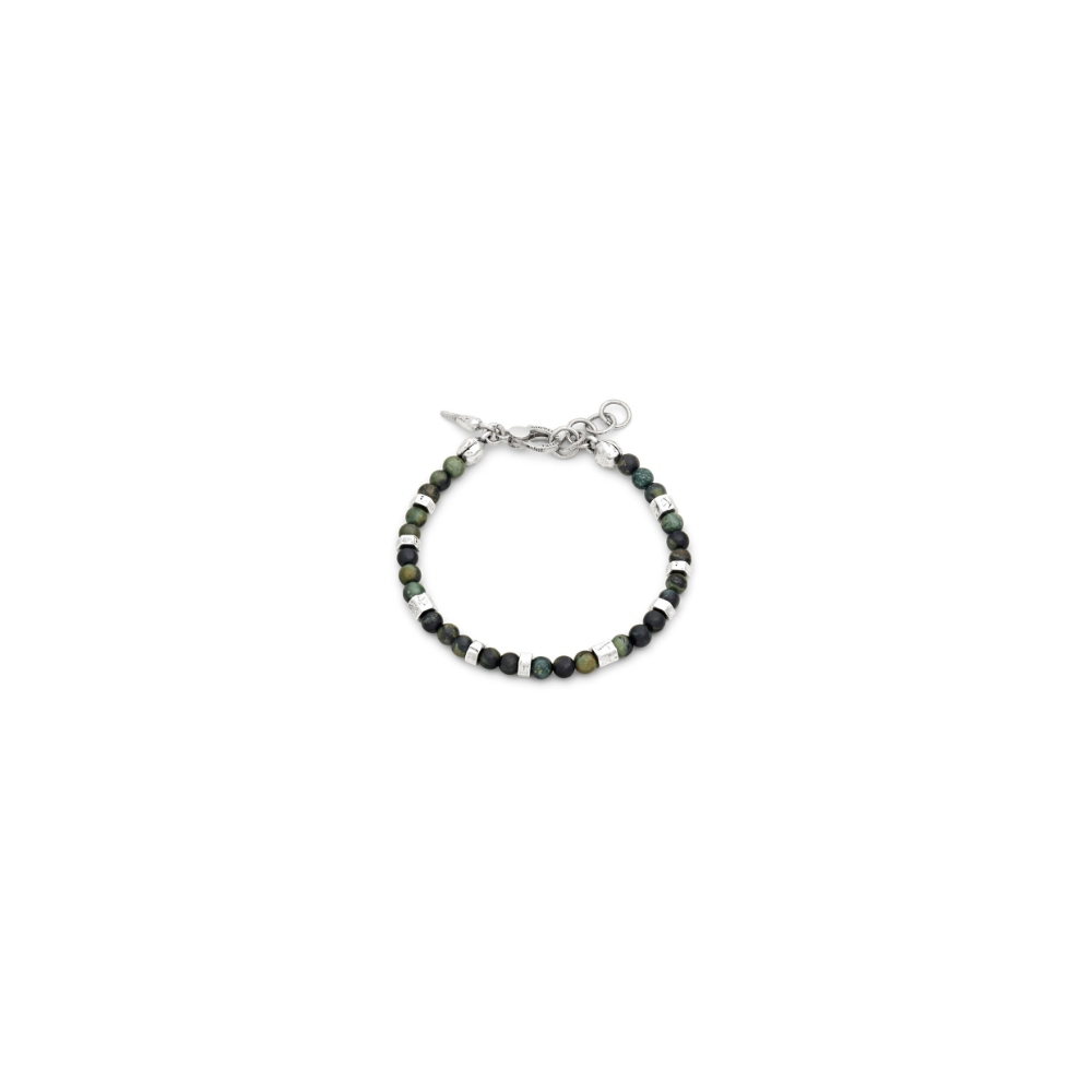 Questo raffinato bracciale è animato da preziose sferette in diaspro verde Kambaba, alternate a inserti in argento dalla superficie sfaccettata, che imprimono ritmo e movimento alla composizione. Un equilibrio di materiali e volumi che dona al gioiello un carattere autentico e contemporaneo, pensato per accompagnare lo stile quotidiano con discreta eleganza. Interamente realizzata a mano in azienda.
