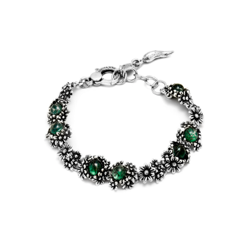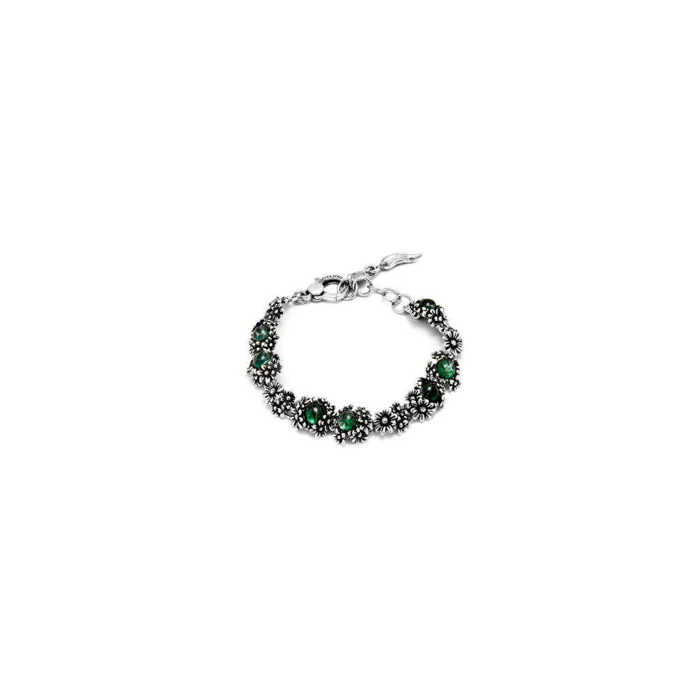 Gemme di un profondo verde che rilucono nel prato di delicate micro-margherite d’argento brunito per questo elegante bracciale. Nei piccoli mondi c’è un fascino e un’eleganza che parlano al cuore. Realizzato a mano in azienda.