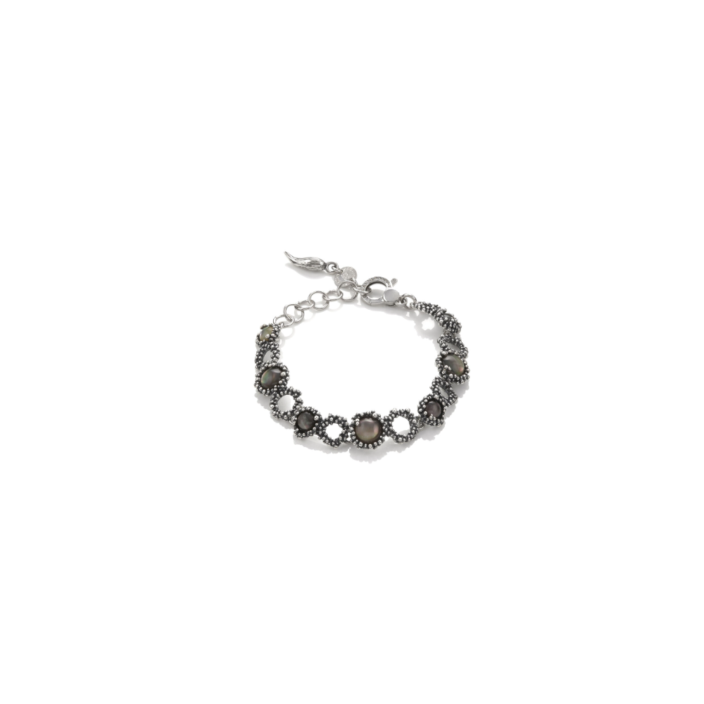 Tutto il fascino dei colori dell'alba su isole lontane è racchiuso in questo bracciale della Collezione Maui. Riflessi cangianti rosa e verdi, grigi e cilestrini risplendono grazie all'effetto chiaroscurale donato dall'argento brunito. Eleganza minimal e cura dei dettagli per un gioiello adatto a molteplici occasioni.