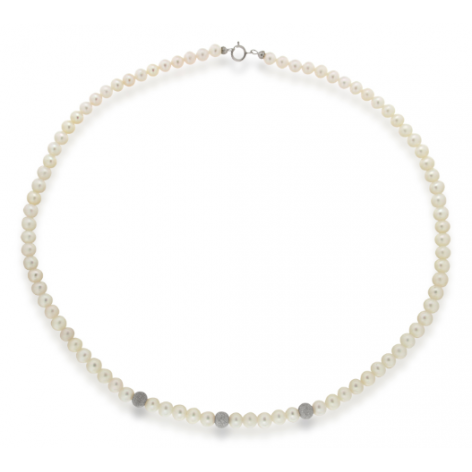 Girocollo con perle coltivate di acqua dolce moschettone e oro bianco.