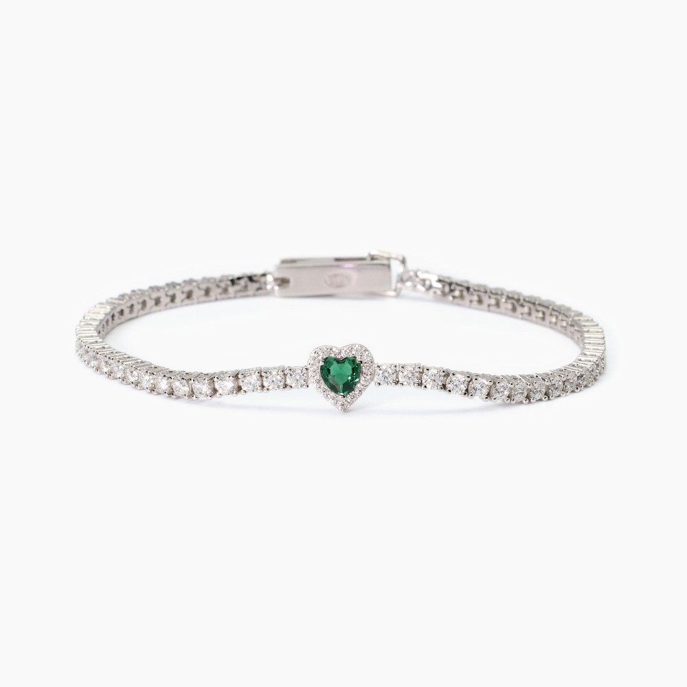 Bracciale tennis da donna in argento rodiato con smeraldo sintentico centrale taglio cuore e zirconi.