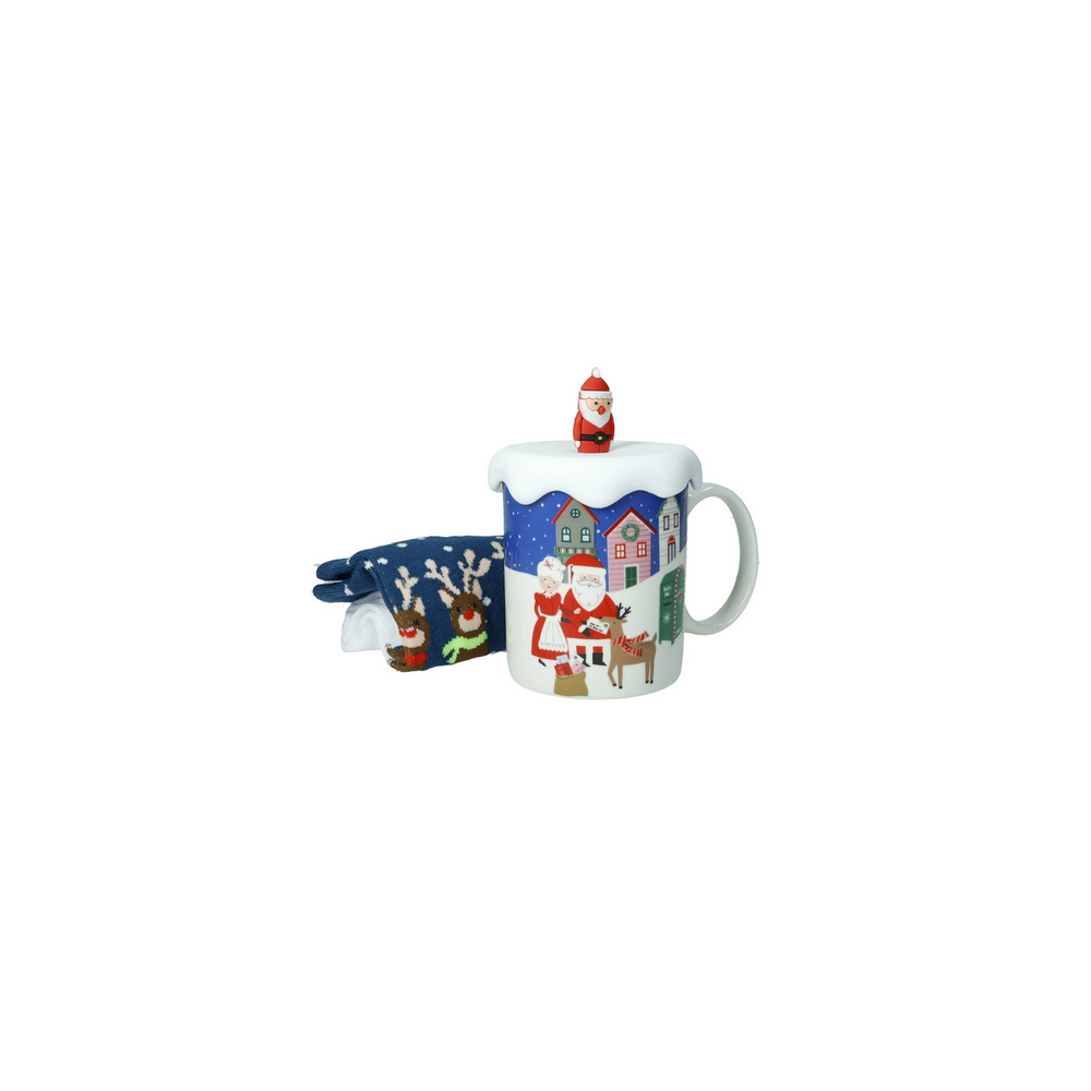 Tappo in silicone con dettaglio Santa Claus . Calzini one-size bianco e blu 100% cotone con decori vari natalizi.Graziosa confezione regalo inclusa!