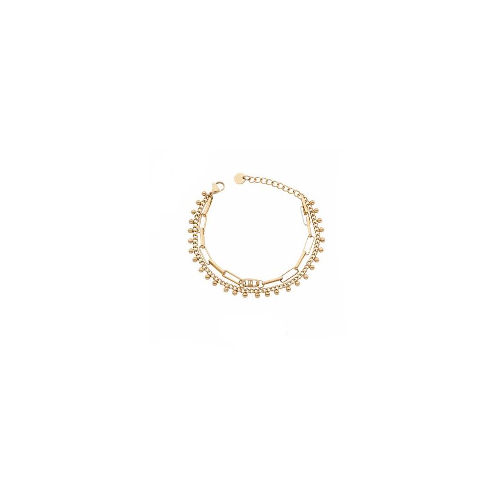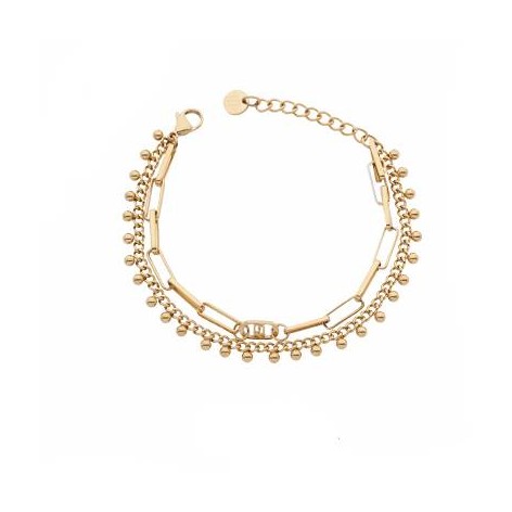 Bracciale da Donna della Marca Liu Jo, il gioiello è realizzata in acciaio gold, caratterizzato da un doppio filo, uno a maglia a catena larga e l'altro con piccole sfere in acciaio. Chiusura a moschettone. Lunghezza 20 cm.