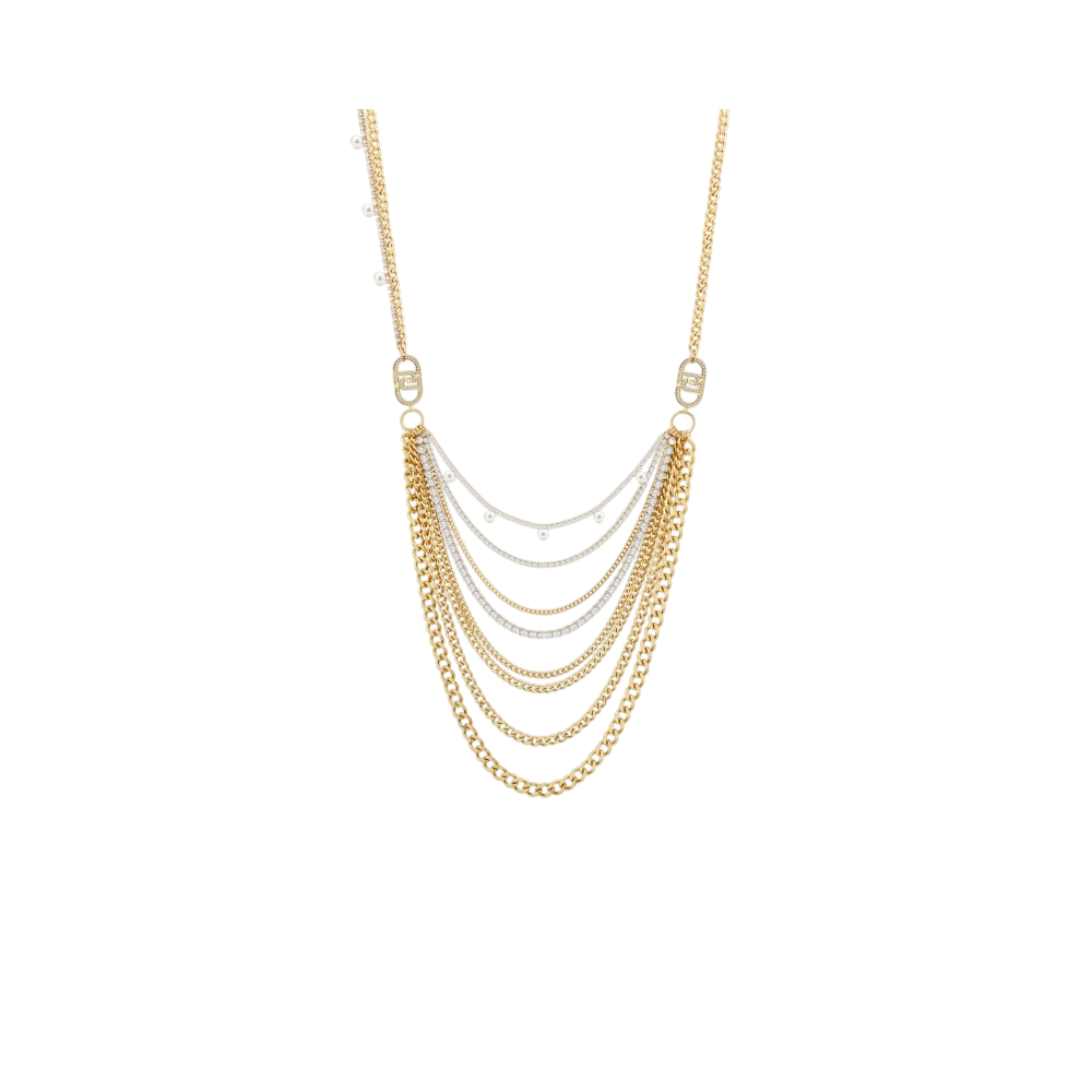 Collana da Donna della Marca Liu Jo, il gioiello è realizzata in acciaio gold, multifili, con zirconi e perle. La lunghezza è di 50 + 5,5 cm (lunghezza riferita al filo più corto). Chiusura con moschettone.
