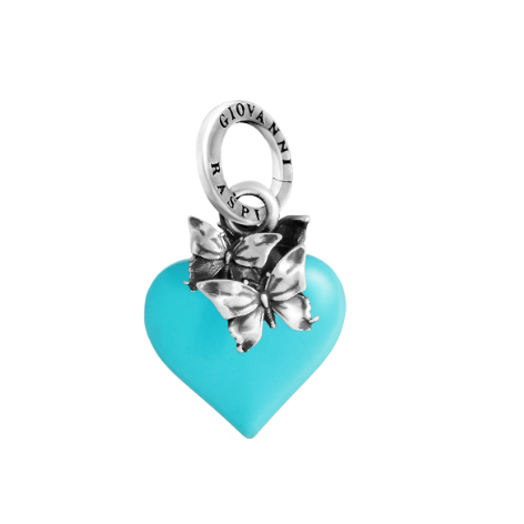 Un raffinato incontro tra passione e leggerezza. Questo charm firmato Giovanni Raspini cattura lo sguardo con un cuore in resina color turchese, impreziosito da farfalle in argento brunito realizzate con la tradizionale tecnica della fusione a cera persa.