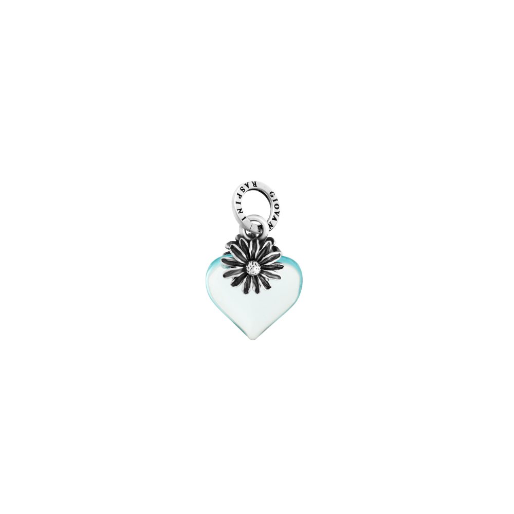 Un’eleganza delicata prende forma in questo charm firmato Giovanni Raspini. Il cuore, realizzato in resina trasparente dal tenue colore azzurro, è sormontato da una delicata margherita in argento brunito, ottenuta attraverso la pregiata tecnica della fusione a cera persa.