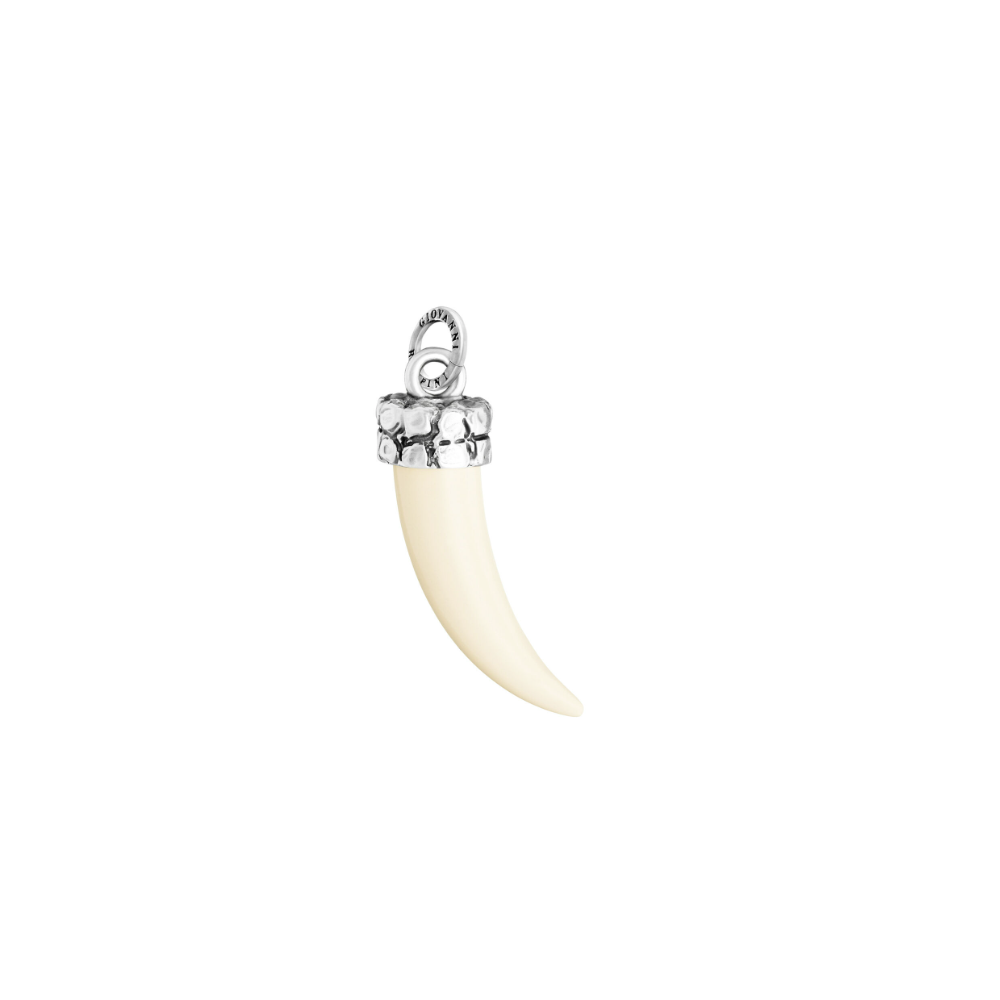 Un oggetto dal fascino primordiale, reinterpretato con maestria artigianale. La zanna, realizzata in resina color avorio, è sospesa a un elemento decorativo in argento brunito, fuso a cera persa secondo l’antica tradizione orafa. La superficie del decoro rievoca la texture della pelle di coccodrillo, in un gioco di luci e rilievi che esalta la forza materica del design.
