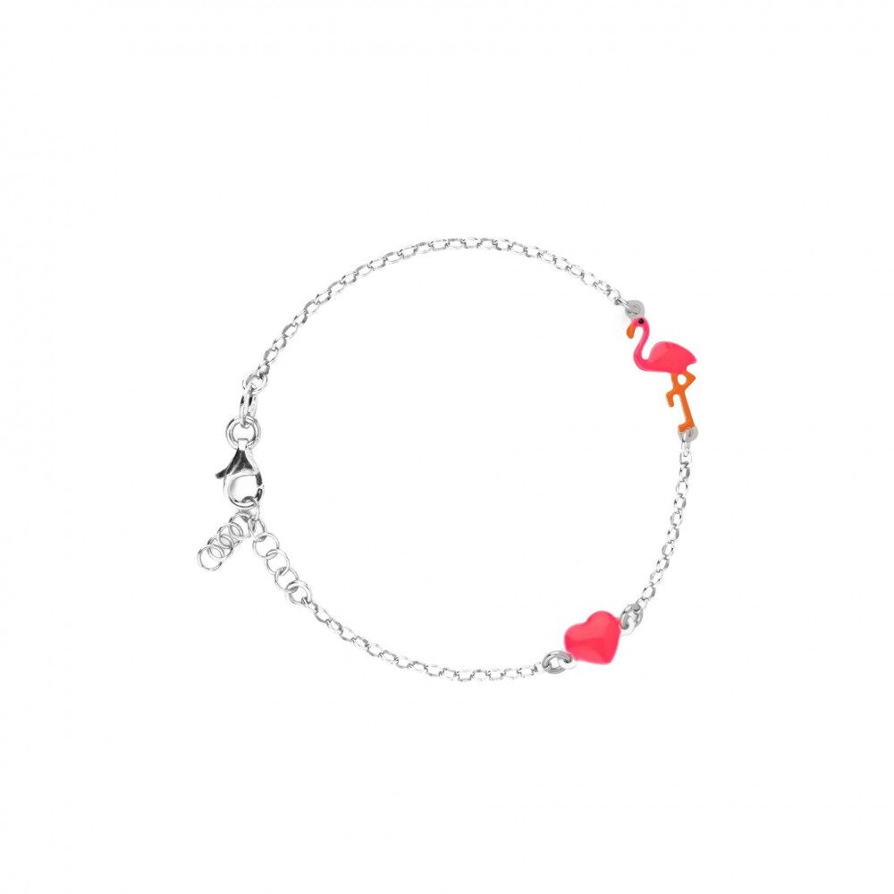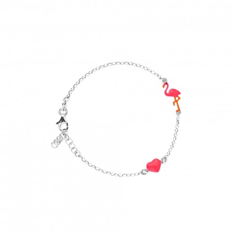 Bracciale in argento 925 con fenicottero e cuoricino smaltati, chiusura a gancio.
