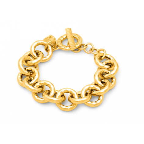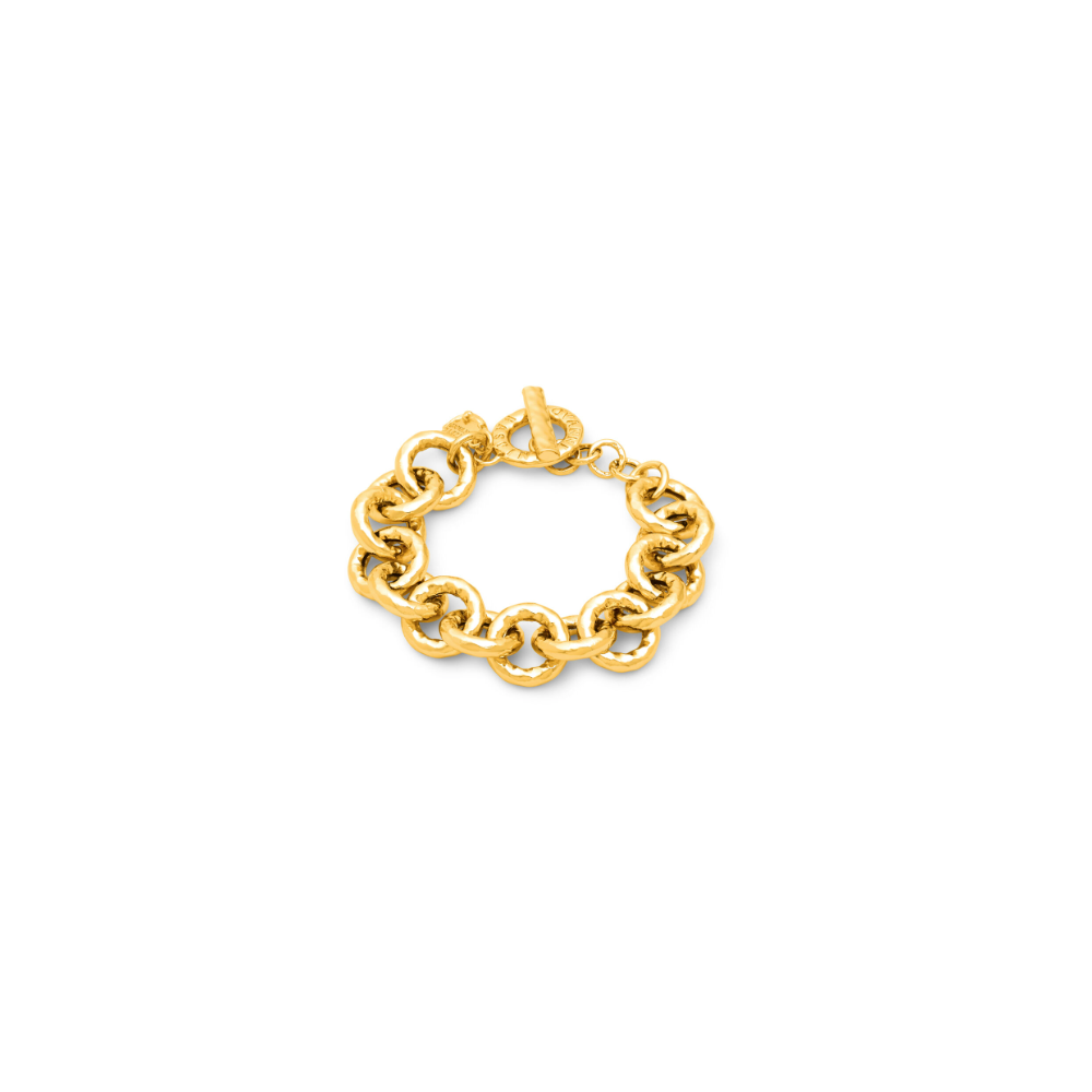 Tutto il fascino della fusione a cera persa in un bracciale a maglia tonda in bronzo dorato con finitura martellata. Luminosa e materica, questa creazione conquista con le sue calde cromie e la chiusura a T-bar. Un gioiello fatto a mano, simbolo dell’eleganza e della maestria artigianale di Giovanni Raspini.
