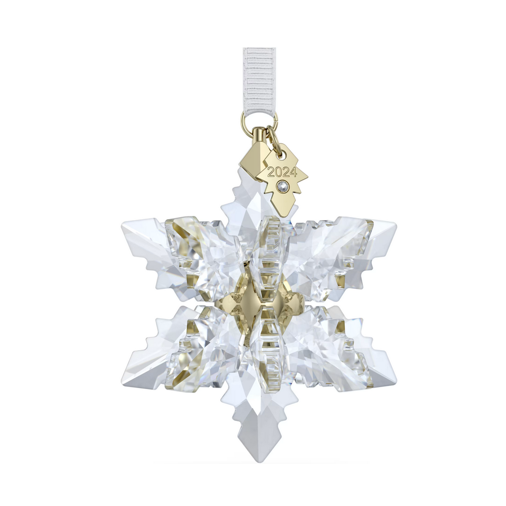 La Swarovski Annual Edition Decorazione 3D di quest’anno racchiude in sé tutta la magia dell’inverno. Questo design 3D trasparente che, con le sue 340 sfaccettature e le 18 singole punte, celebra la bellezza unica dei fiocchi di neve, è un magistrale esempio di savoir-faire Swarovski. Sospesa su un nastro gros-grain bianco, la decorazione presenta una parte centrale in tonalità oro champagne lucido ed è completata da una targhetta con l’incisione “2024”. Ideale da appendere ad una finestra o all’albero, proietterà una meravigliosa luce su tutte le tue decorazioni natalizie. Oggetto decorativo. Non è un giocattolo. Non adatto ai bambini di età inferiore a 15 anni.