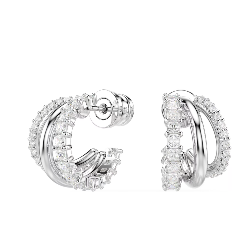 Gli orecchini Hyperbola, magistralmente realizzati, mettono in risalto una bellezza unica. Su ciascun lato, i tre mini cerchi sono presentati con placcatura rodio, impreziositi da Swarovski Zirconia con tagli Round e Square in una montatura a griffe. Abbinali a un bangle o a un pendente coordinato per un look mozzafiato.