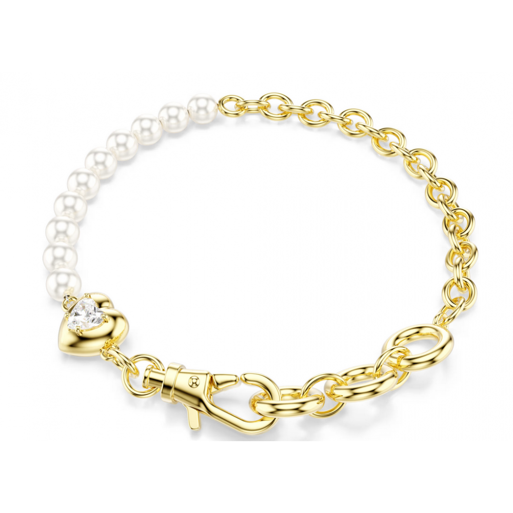Diviso tra una catena placcata in tonalità oro e una fila di Crystal Pearls Swarovski bianche, l’espressivo bracciale presenta una maglia a moschettone e un piccolo motivo a cuore per una delicata espressione d'amore. Indossalo da solo o come bracciale portafortuna per i nostri charm Swarovski.