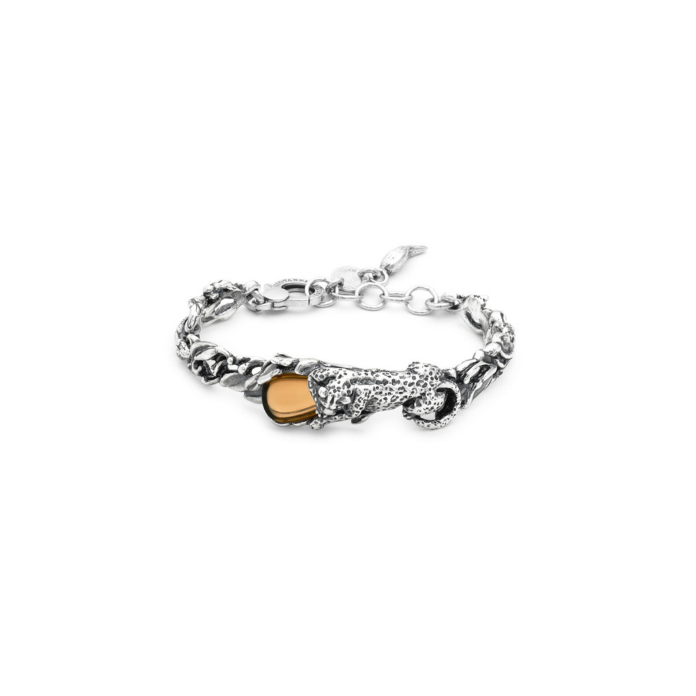 Piccolo capolavoro animalier, il bracciale Goccia Leopardo unisce la raffinatezza di un leopardo disteso, realizzato in argento con la tecnica della fusione a cera persa, all'intensità del cristallo color giallo citrino. Il design semirigido è completato da una catena in argento, per un gioiello fatto a mano che esprime equilibrio, forza e bellezza.