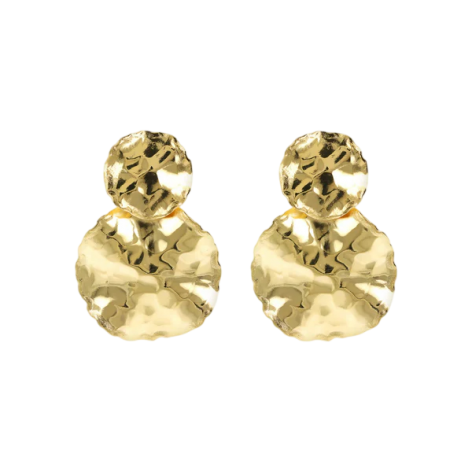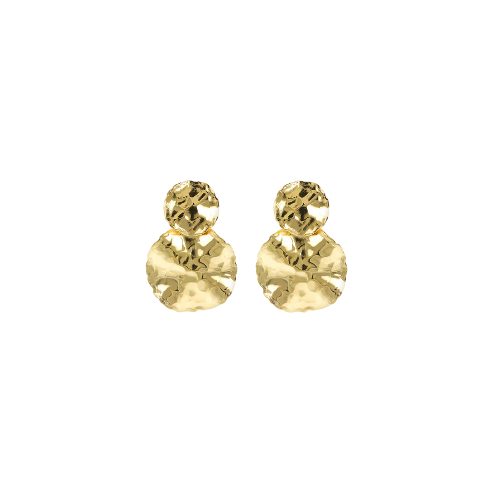 Orecchini pendenti Etrusca Gioielli realizzati in lega Golden, placcata Oro giallo 18kt o Rodio, con due dischi graduati (17-28 mm) e superficie martellata. Lunghezza 4 cm. Chiusura a perno e farfalla.