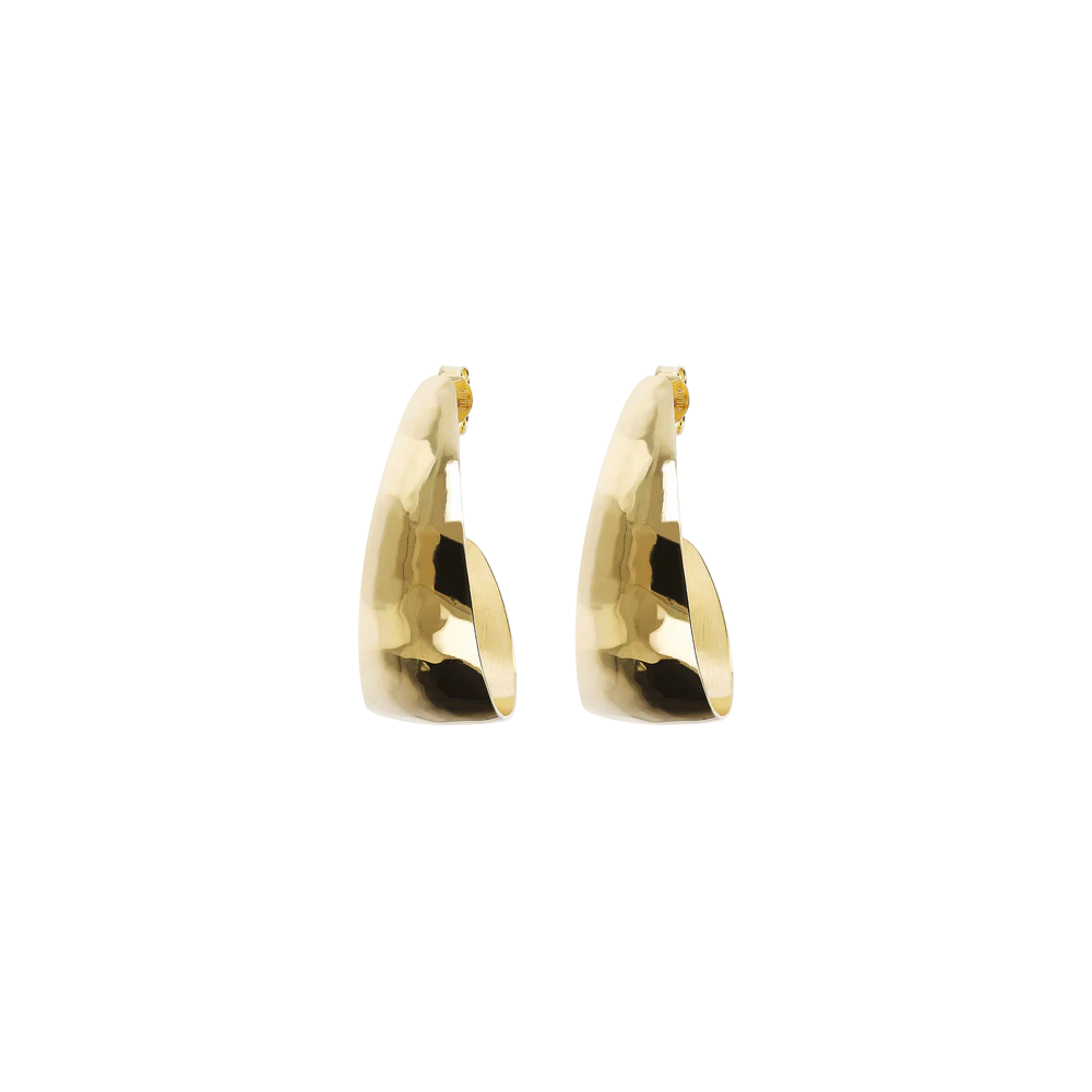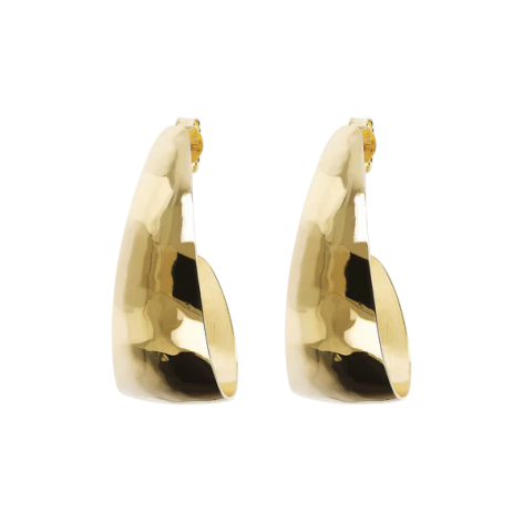 Orecchini pendenti a cerchio Etrusca Gioielli realizzati in lega Golden, placcata oro giallo 18kt, impreziositi da un design a ricciolo con superficie martellata; chiusura a perno e farfalla; lunghezza di 3 cm.