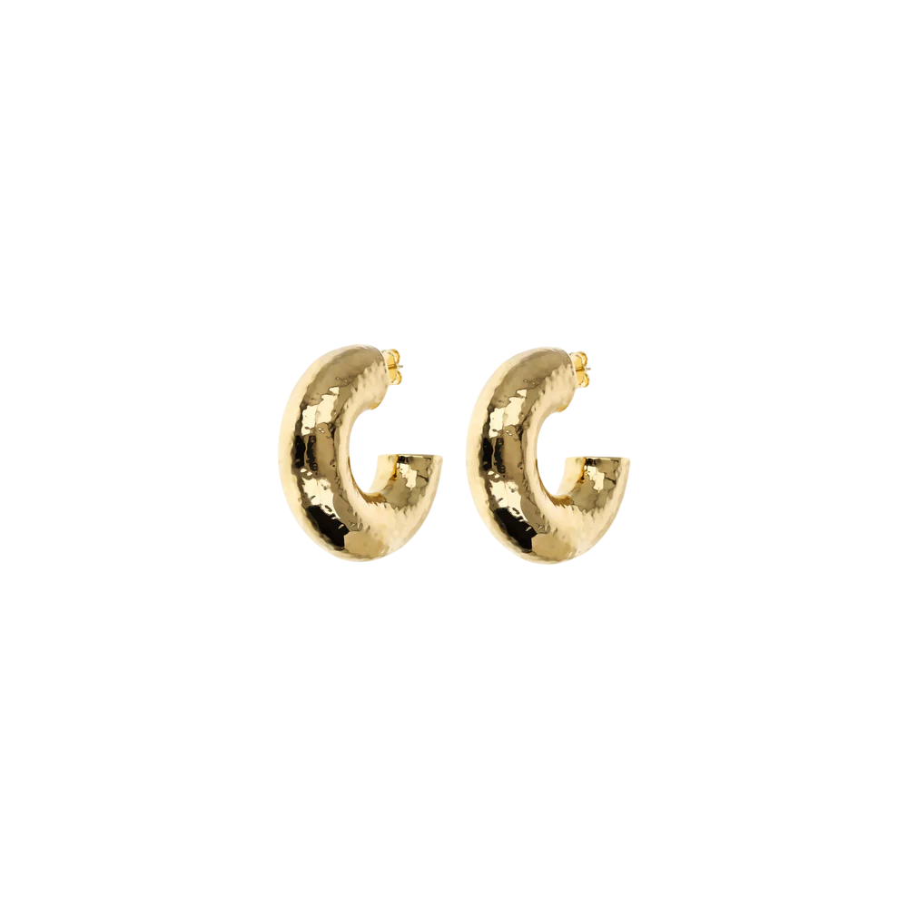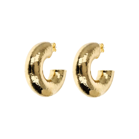Orecchini a lobo Etrusca Gioielli realizzati in lega Golden, placcata Oro giallo 18kt, dal design a semi-cerchio con superficie martellata. Diametro 42 mm. Spessore 13 mm. Chiusura a perno e farfalla.