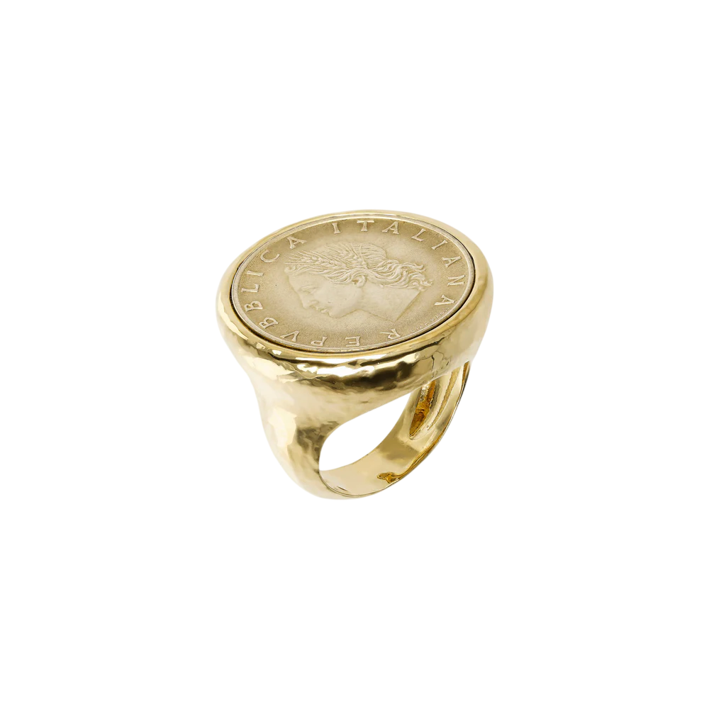 Anello chevalier Etrusca Gioielli realizzato in lega Golden, placcata oro giallo 18kt, con superficie martellata e impreziosito da una moneta originale.