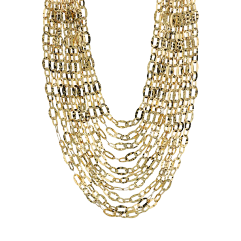Collana multi-filo Etrusca Gioielli realizzata in lega Golden, placcata Oro giallo 18kt, con 10 file graduate di maglie ovali martellate. Lunghezza 56+x cm di estensione. Chiusura a moschettone.