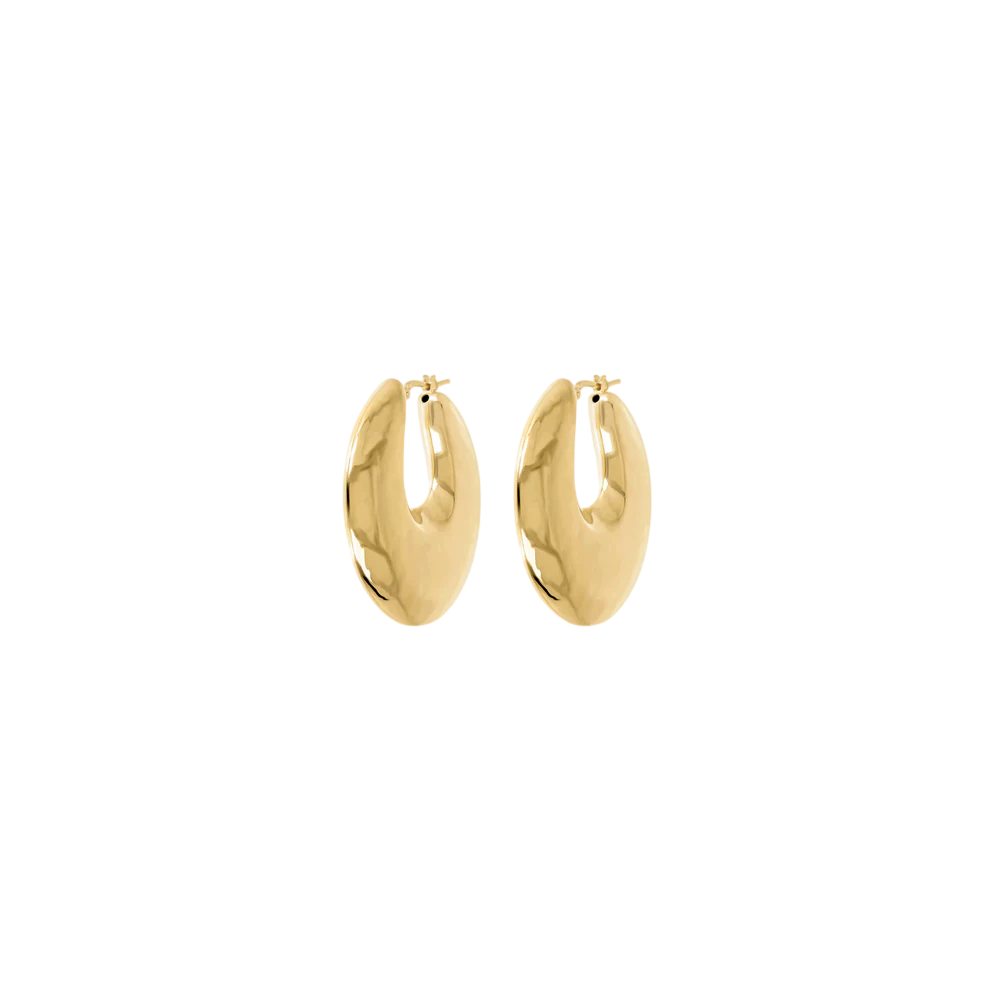 Orecchini a cerchio Etrusca Gioielli realizzati in lega Golden, placcata oro giallo 18kt, dalla forma a mezzaluna con superficie martellata; chiusura a baionetta.
