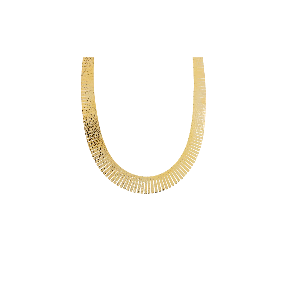 Collana girocollo Etrusca Gioielli realizzata in lega Golden, placcata Oro giallo 18kt, con maglia Cleopatra. Superficie finemente martellata di 14mm di larghezza. Chiusura a moschettone.