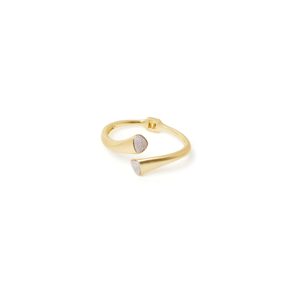 Questo bracciale semirigido di gran classe è l'ideale tocco finale per un look che ti distingue. Design radioso con due splendenti semicerchi che si sviluppano in torsione accogliendo due brillantissimi terminali in pavè di zirconi dai riflessi inebrianti. Un accessorio perfetto per un look impegnato o per quando vuoi tu, in una versione dalle cromie delloro finitura matte bianco trasparente, con logo Sodini inciso.