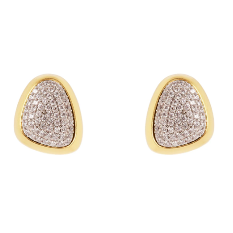 Esclusivi ed eleganti questi orecchini aggiungono un tocco moderno su qualsiasi mise. Design radioso con pavè di brillantissimi zirconi in una cornice aurea per un unicum che illumina il viso. Una coppia di accessori perfetti per un look impegnato o per quando vuoi tu, in una versione dalle cromie delloro finitura matte e bianco trasparente, con logo Sodini sul retro.