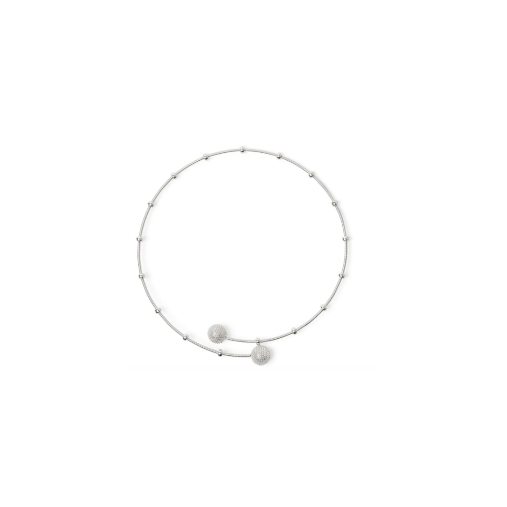 Moderna ma dal fascino retrò questa collana corta aggiunge un tocco esclusivo su qualsiasi mise. Design con radioso filo argenteo che ospita degli spendenti anellini e due luminose boule a microsfere alle estremità, per un unicum di grande effetto. Un accessorio perfetto in qualsiasi occasione, in una versione dalle cromie del rodio, con logo Sodini.