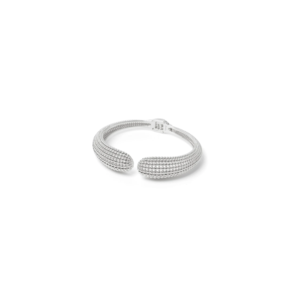 Questo principesco bracciale rigido è l'ideale tocco finale per un look che non passa inosservato. Design con due splendenti semicerchi affusolati impreziositi da finitura a micro sfere, per regalare radiosi effetti cromatici alla tua mise. Un accessorio perfetto in qualsiasi occasione, in una versione dalle cromie del rodio, con logo Sodini al'interno.